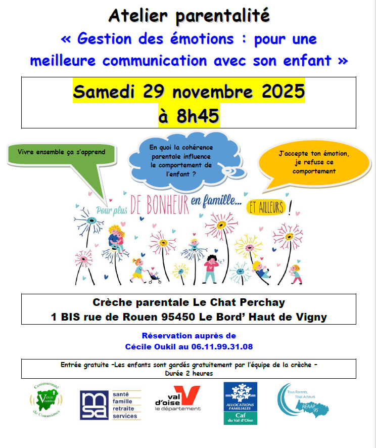L’associatiion Crèche Parentale « Le Chat Perchay » en partenariat avec MVO vous inviite à un GROUPE de PAROLE dans un cadre chaleureux et bienveillant :« Gestion des émotions : pour une meilleure communication avec son enfant »